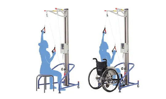電気制御式負荷機構を装備した交互滑車訓練器です。肩腕挙上、自助介助運動に加えて、抵抗運動も安全におこなえます。